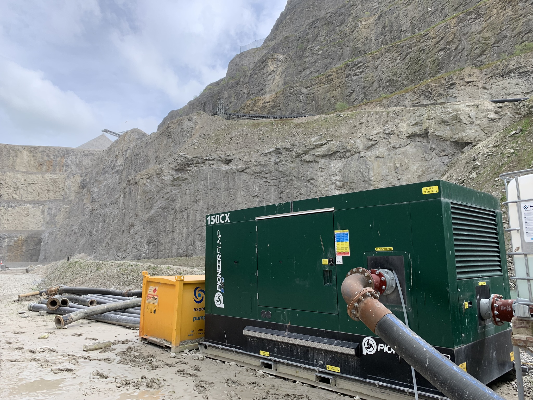 Our customer, a large aggregate quarry, required a pumping solution to increase efficiency on one of their sites. There were environmental considerations on this site, as the customer’s existing pump house was situated at the bottom of a sheer drop, and the water level in the lagoon had risen to such a level that existing pumps and electrical infrastructure had become submerged and unusable. They required an immediate solution to reduce the water level and then a longer-term solution to keep the lagoon under control.